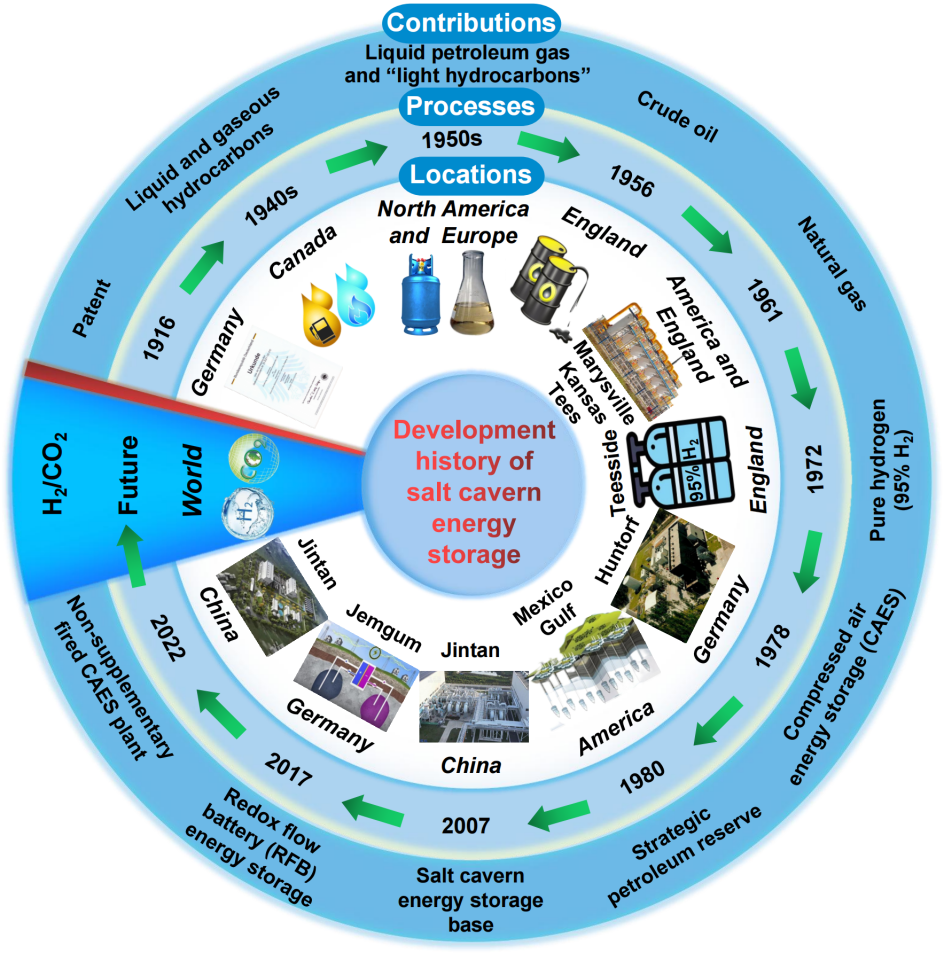 论文概要:为实现中国2030年碳中和以及2060年碳平衡目标,发展大规模的储能(碳封存)技术势在必行。在地下盐层中,采用水溶法建造的盐穴体积大、稳定性与密闭性良好,是大规模储能的理想空间。目前,盐穴已广泛应用于天然气、原油、氢气、压缩空气等能源的储存。随着可再生能源的调峰需求以及碳达峰和碳中和目标临近,盐穴有望在压缩空气储能(CAES)、大规模储氢和中长期二氧化碳储存等方面发挥更有效的作用。此综述论文的创新之处在于对盐穴储能技术的历史、现状和未来发展趋势进行了全面的回顾。首先,回顾了国内外各类盐穴储气/储油技术的发展概况,并对盐穴储氢技术的发展前景进行了展望。其次,提出了一种基于碳循环的盐穴二氧化碳储存模型,以有效解决碳捕获与利用的时空差异。在未来的计划中,盐穴将通过促进碳封存、压缩空气储存和氢储存,在整个碳循环中发挥至关重要的作用。此外,介绍了利用盐穴沉渣空间进行大规模储能的新构想。最后,突出中国盐穴储能的未来发展将以大规模、集成化和智能化项目为重点,强调了盐穴储能在提高效率和可持续性方面的重要性。