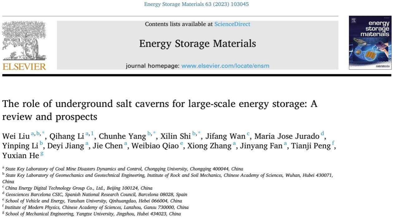 11月,我院姜德义团队刘伟研究员在国际能源类顶尖学术期刊《Energy Storage Materials》(IF=20.4)发表综述性研究,论文题为《The role of underground salt caverns for large-scale energy storage: A review and prospects》(地下盐穴在大规模储能中的作用:综述与展望),重庆大学煤矿灾害动力学与控制全国重点实验室为第一完成单位和第一通讯作者单位。该论文是对地下盐穴引领大规模存储未来这一前沿性领域的系统性回顾、总结及展望。其中,我院李启航博士为共同一作,中国科学院武汉岩土所杨春和院士与施锡林研究员为共同通讯作者,我院姜德义教授、中科院武汉岩土所李银平研究员等专家对本论文撰写提供了重要思路和全程指导,中国能建数科公司万继方主任、西班牙国家研究委员会MJ Jurado教授等为本论文共同作者。