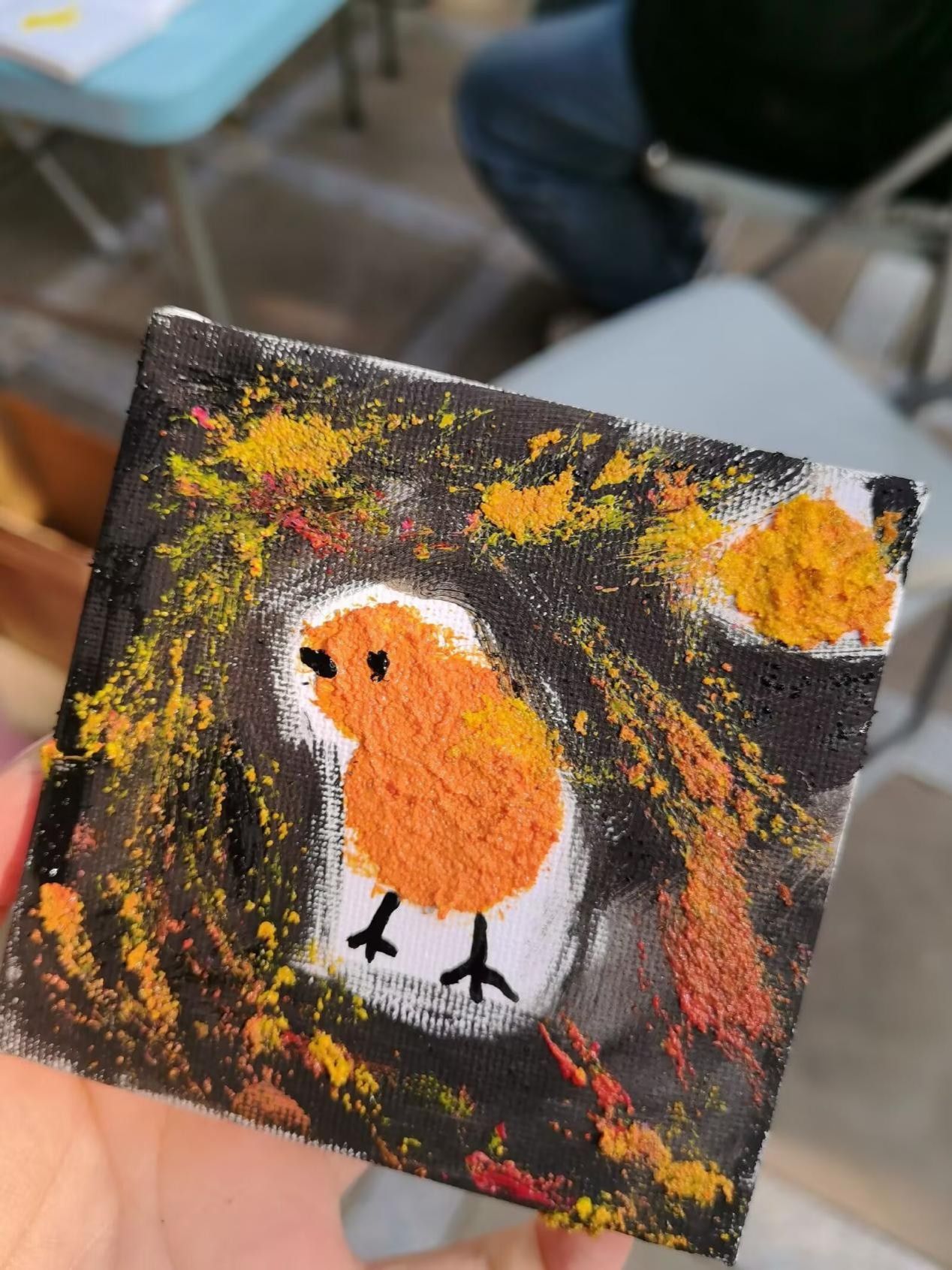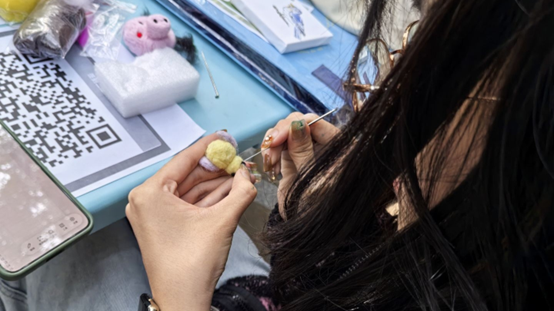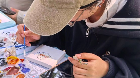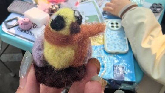 “观羽疗心”板块则通过“声羽识知”“形韵速记”“绘鸟释压”及“迷宫观鸟”等环节,激发学生对鸟类外形与鸣声的专注观察与表达,提升其对自然的感知能力。同学们积极参与互动,现场气氛热烈,尤其是在"迷宫观鸟"环节,大家认真记录观察结果,互相分享发现的乐趣。手工创作区更是人气高涨,同学们在绘制肌理画、制作羊毛毡的过程中,释放压力,展现创作热情,将自然之美转化为手中的艺术品。