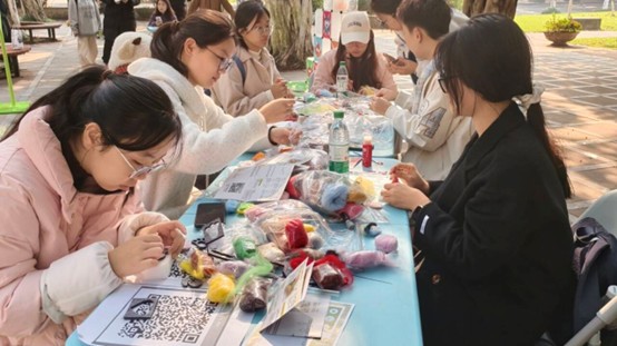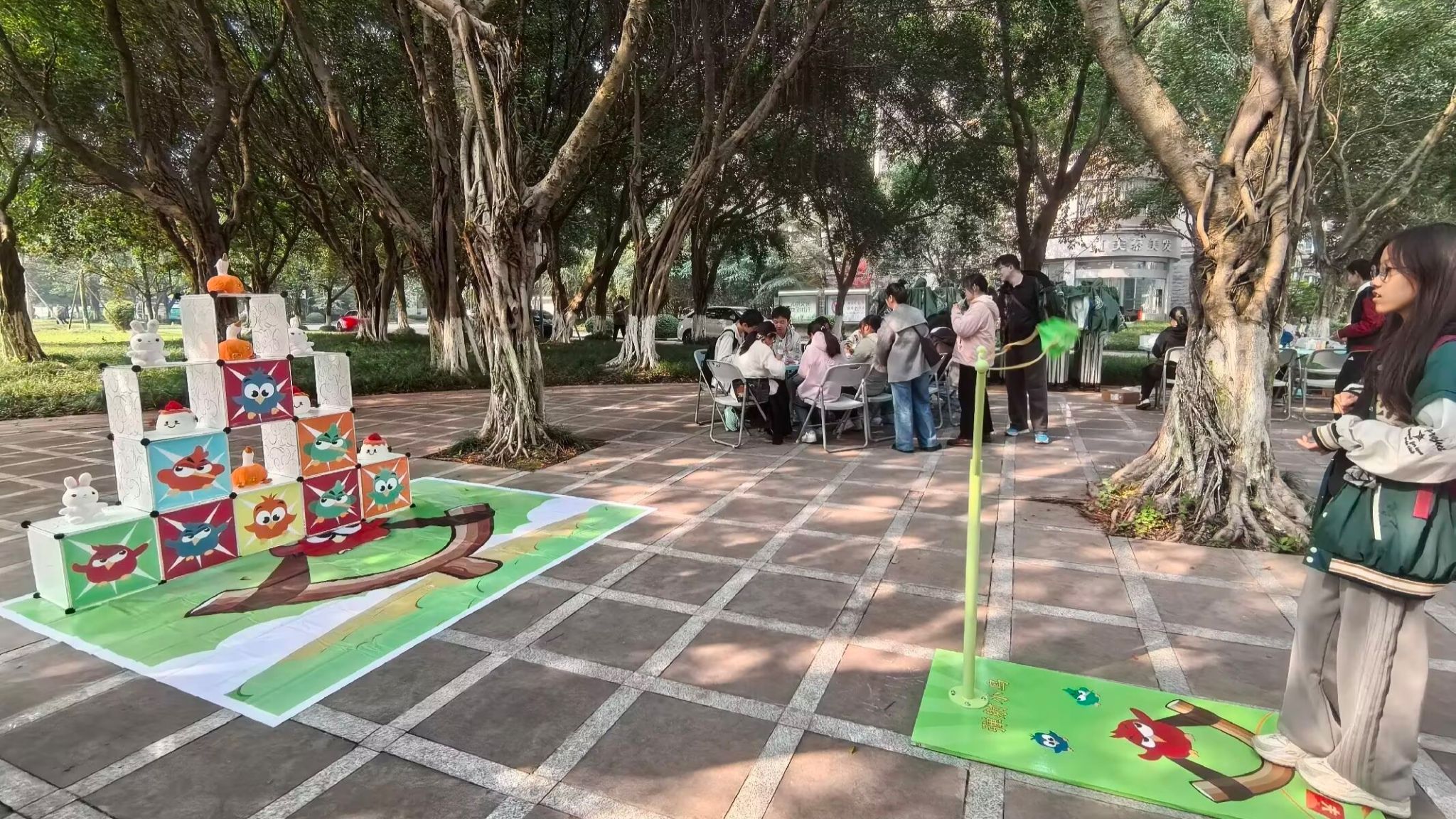 活动共分为四大板块:“帐中听羽,影韵传情”、“观羽疗心,知行趣探”、“护生传情,艺趣同行”及“叶语心声,羽梦留痕”。四大板块下有多个小活动。秋日的校园广场上人头攒动,同学们参与热情高涨,每个展位前都排起了长队。活动现场的展板上附有专属二维码,参与者扫码即可了解本活动背后的心理疗愈原理,如“注意力恢复理论”、“生物亲和性假说”等科学依据,将直观的自然体验与心理健康知识生动结合,引导同学们在参与中理解疗愈,在实践中发现科学。