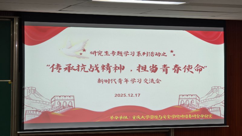 当历史的回响与时代的脉搏同频共振,当青春的担当与科研的热忱撞个满怀,重庆大学资源与安全学院2025年研究生专题学习活动之“传承抗战精神,担当青春使命”新时代青年学习交流会,于12月17日在科学城校区虎溪校园D1131教室顺利举办。资安研究生齐聚一堂,在学习中感悟精神力量,在竞技中凝聚奋进共识。