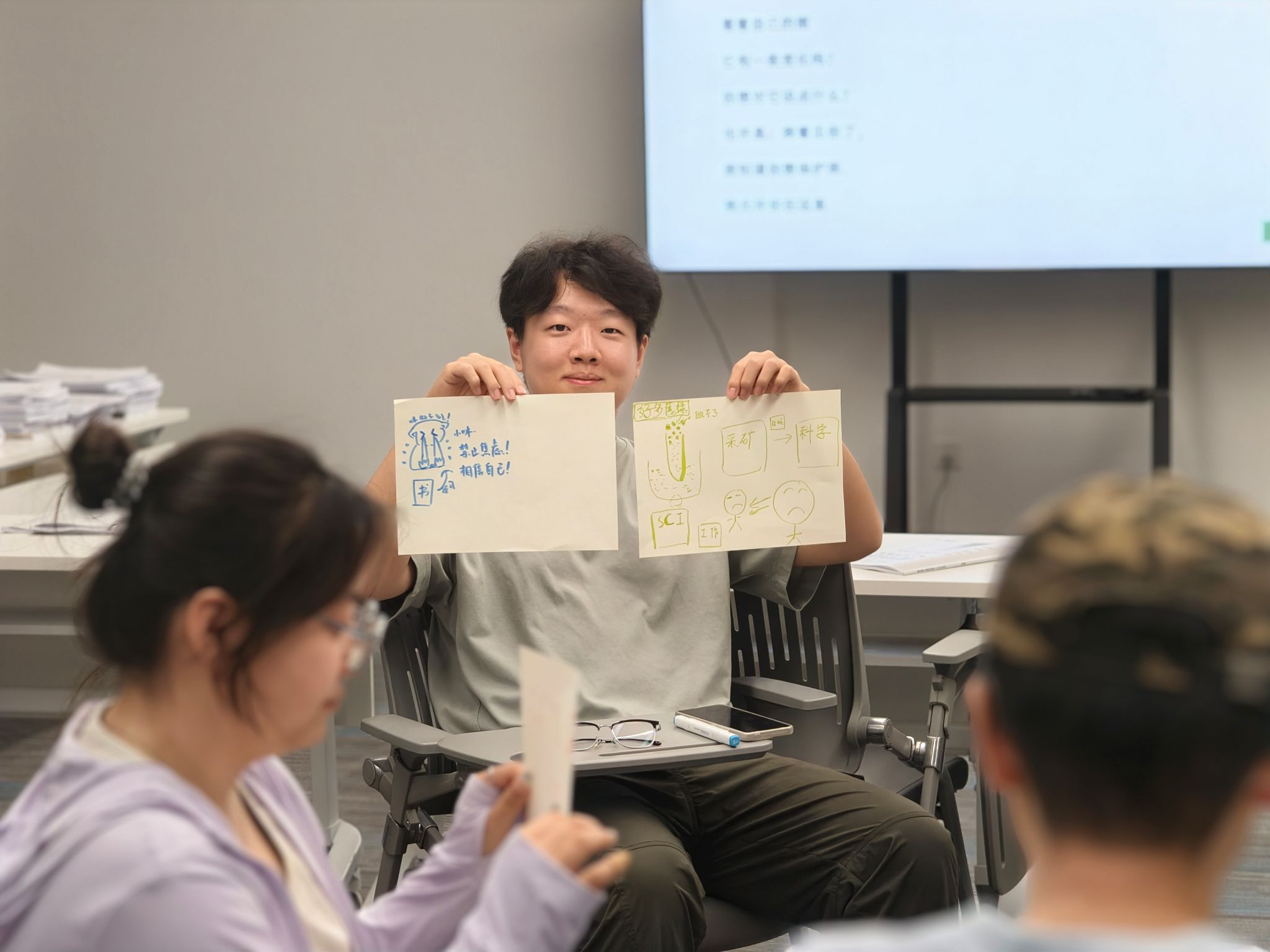 随后的三色便签反思环节,付老师引导大家围绕 “核心职责、工作困扰、必备能力” 深度思考,清晰定位自身角色。培训核心环节聚焦心理委员四大核心身份 ——观察员、支持者、活动家、宣传员,系统讲解工作职责与工作边界,重点强调倾听、共情、不评价、不解决的核心原则。通过 “推开版” 与 “走近版” 沟通话术对比、完整对话场景实操演练,让心理委员直观掌握共情技巧,明确 “不替对方决策、只做情绪陪伴” 的工作内核,学会有效接住同学情绪、引导自我探索。